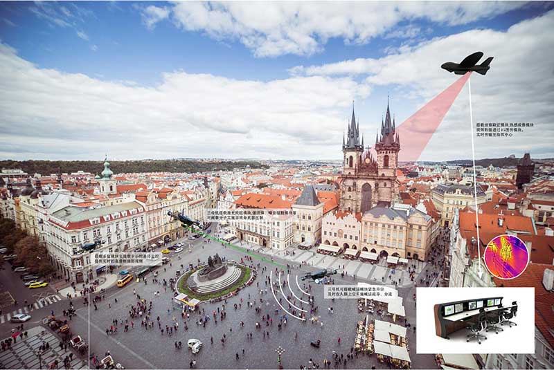 在防區(qū)群眾疏散過(guò)程中,鷹眼一號(hào)偵察型固定翼無(wú)人機(jī),可搭載視頻偵察設(shè)備,對(duì)整個(gè)防區(qū)實(shí)施大面積空中偵察,實(shí)時(shí)監(jiān)控疏散現(xiàn)場(chǎng)的全局動(dòng)態(tài),為后臺(tái)指揮決策提供全面、宏觀的現(xiàn)場(chǎng)情報(bào)支撐;鷹眼二號(hào)系留型六旋翼無(wú)人機(jī),可搭載系留模塊和偵察模塊,對(duì)重點(diǎn)區(qū)域?qū)嵤?60度的長(zhǎng)時(shí)間、定點(diǎn)監(jiān)控;上述偵察視頻均可實(shí)時(shí)傳輸至指揮中心,為指揮決策提供第一手素材。