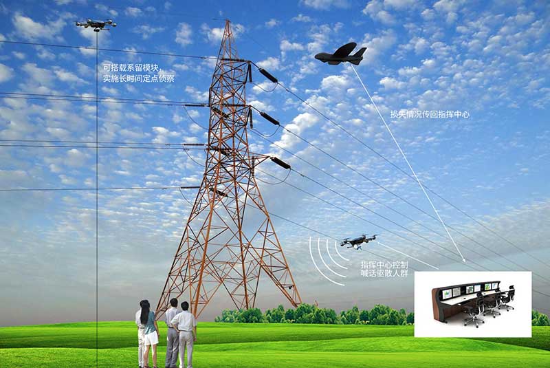 鷹眼一號(hào)偵察型固定翼無(wú)人機(jī),可在第一時(shí)間到達(dá)電力受損區(qū)域上空,通過(guò)實(shí)時(shí)空中偵察,將損失情況傳回指揮中心,為領(lǐng)導(dǎo)全面及時(shí)了解損失情況、制定搶修方案提供第一手資料。 鷹眼二號(hào)系留型六旋翼無(wú)人機(jī),可搭載系留模塊,對(duì)電力受損現(xiàn)場(chǎng)實(shí)施長(zhǎng)時(shí)間定點(diǎn)偵察,為后臺(tái)指揮提供現(xiàn)場(chǎng)視頻。